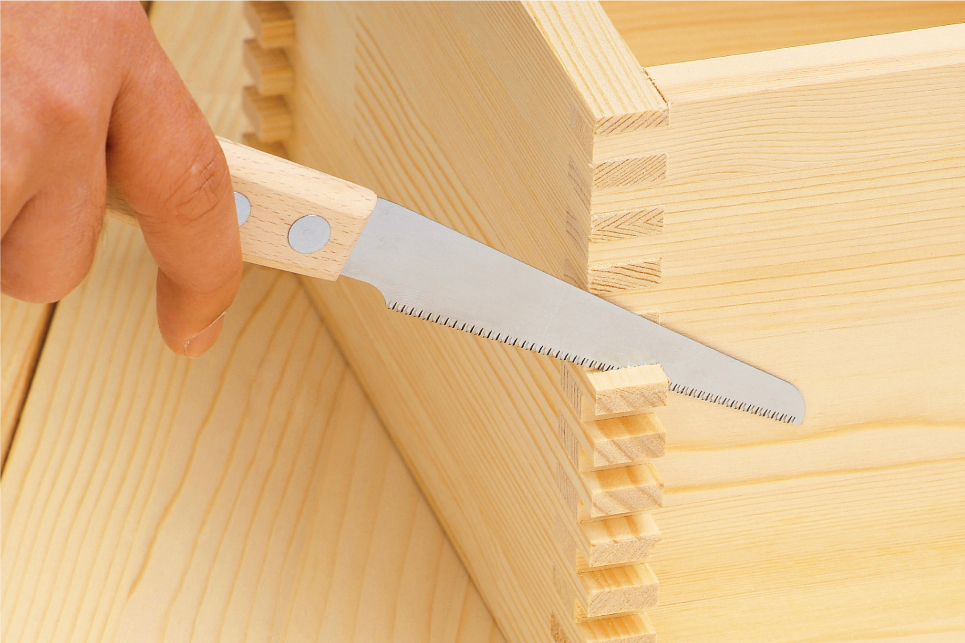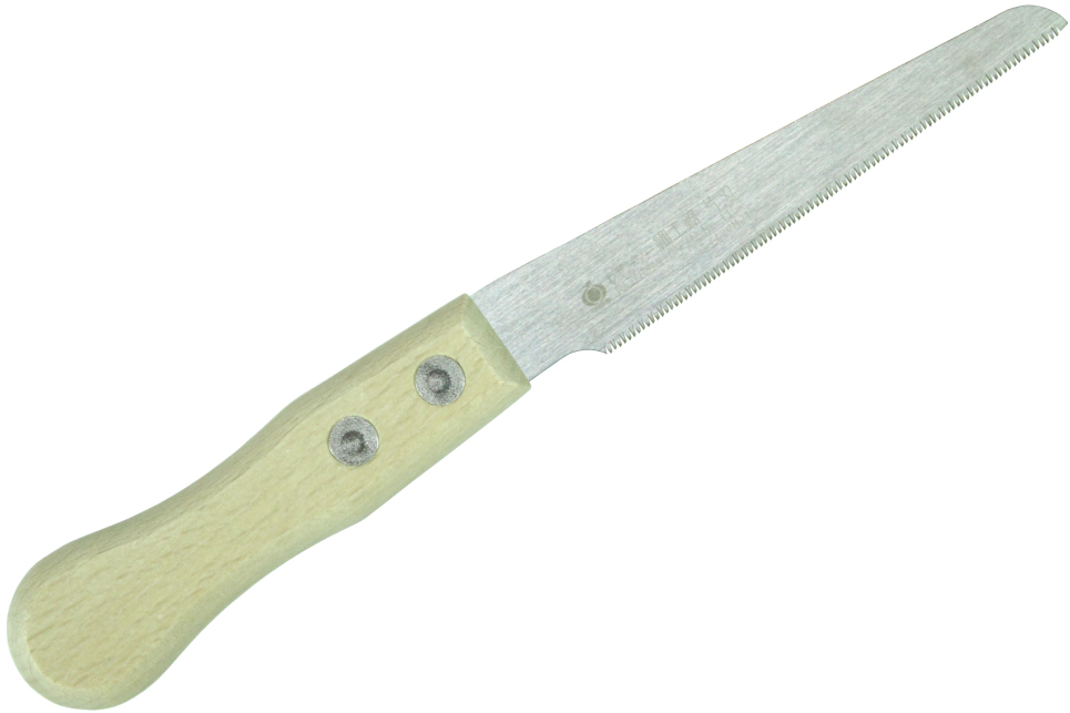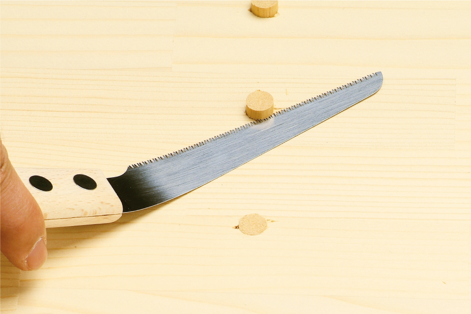 Fine teeth with teeth pitch 1.0mm. The blade width is smaller towards the tip. You can cut small things, so it's great for craft work. The blade is only 0.3mm thick and is flexible. You can stabilize the saw by putting the handle on the material you are cutting. You can cut dowels this way. Since the handle is made of wood, it will not leave any damages or marks on the material.