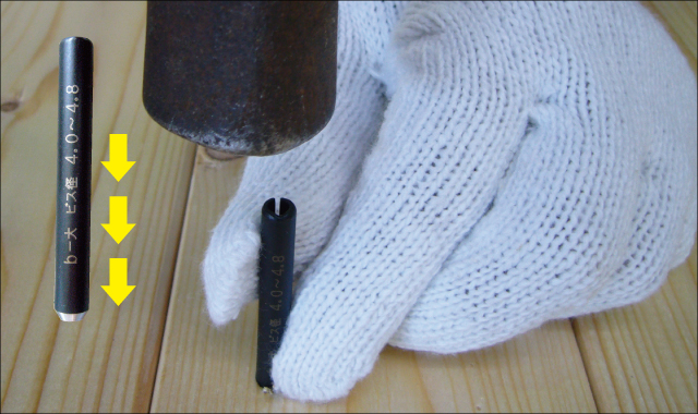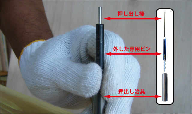 7. 아래에서 압출 지그, 제거한 전용핀, 압출봉 순서로 놓고, 압출봉을 두드리면 전용 핀에서 나사가 빠집니다