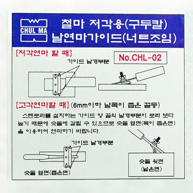 - 고각 연마시에는 가이드 양 끝 날개부분이 숫돌에 갈릴 수 있으므로 숫돌 옆면(좁고 높게)을 이용하여 연마하시기를 추천합니다