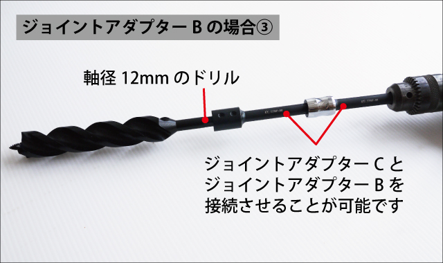 조인트 어댑터 B에는 축경 12mm 육각축의 선단 공구를 장착합니다. star-m의 쇼트 비트 31~38mm, 겸용 비트 31~38mm, 곰 드릴 24~38mm가 설치 가능합니다. 조인트 어댑터 C는 축경 12mm가 설치되므로 조인트 어댑처 B의 설치가 가능합니다