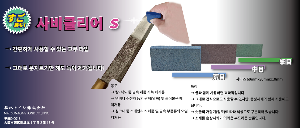 - 세목#246, 중목#120, 황목#80 세 종류가 있으며 금속에 생긴 녹을 제거하는 녹 지우개 형태입니다